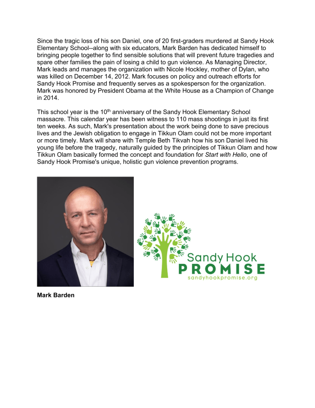 Please join us for the Annual Rabbi Israel S. Dresner Tikkun Olam Lecture Friday, May 19, 2023, during Erev Shabbat Services, 7:30 pm with Very Special Guest Lecturer Mark Barden, Co-Founder and Managing Director of Sandy Hook Promise on “Tikkun Olam: Empathy and Compassion”