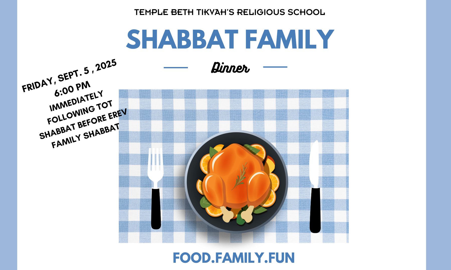 The first Friday of every month, immediately following Tot Shabbat we will be hosting a Family Shabbat Dinner for our Religious School Families, Young Families, and anyone else who would like to attend.