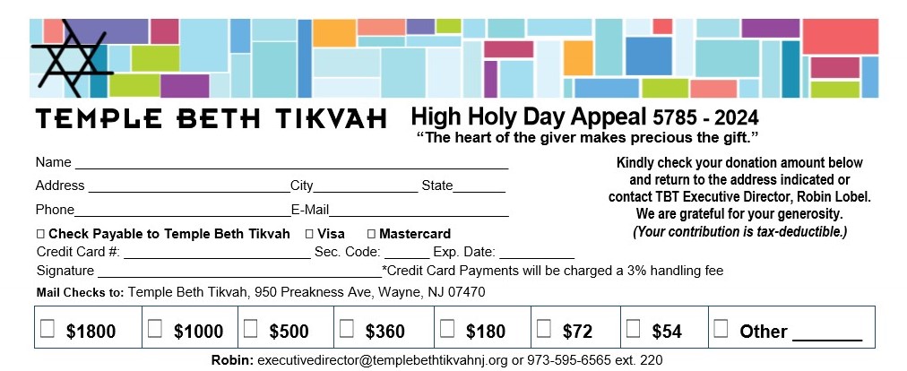 Legacy Giving: Leave a lasting legacy by including Temple Beth Tikvah in your estate planning. This helps ensure that future generations continue to benefit from our spiritual home.