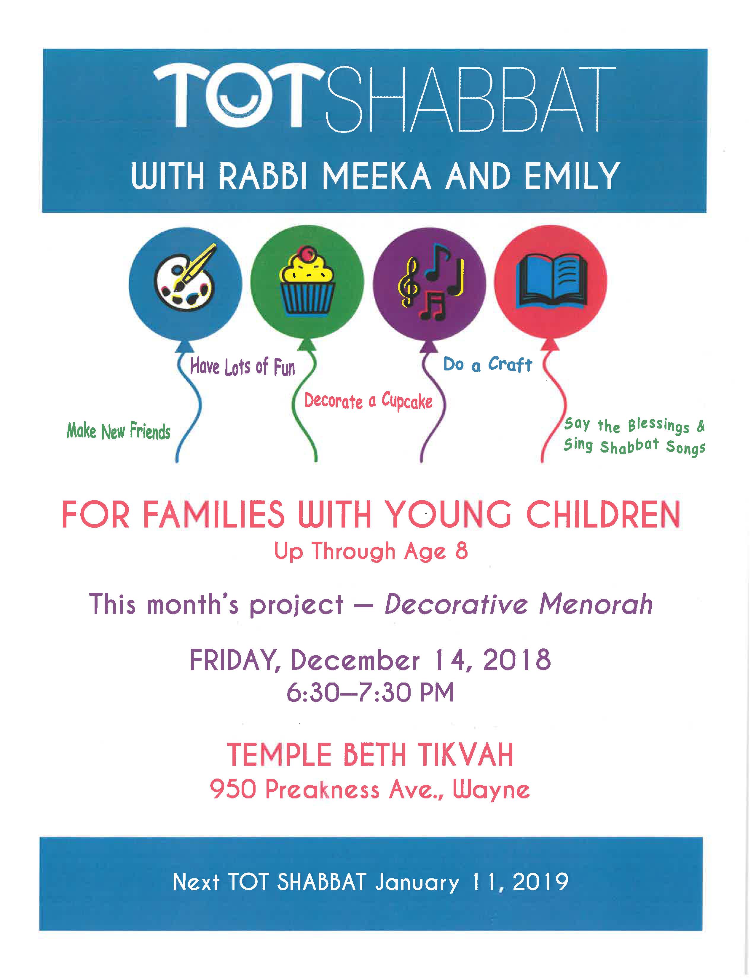Join us for Tot Shabbat Friday, December 14, 2018 at 6:30 pm